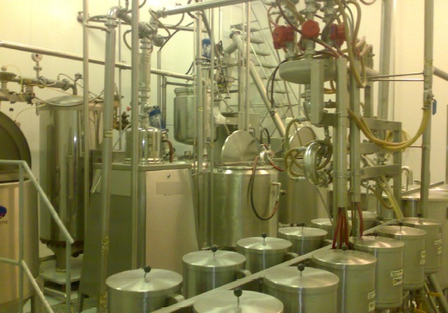 The ingredients are weighed in the right sequence cooked in a continuous cooker, vacumized.
