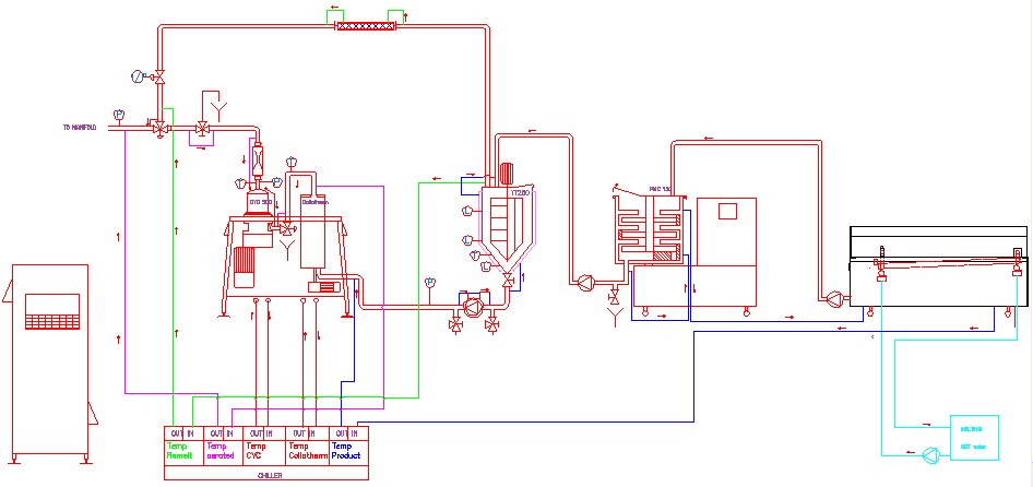 Inside the scraped surface heat exchanger, and the jacketed and temperated piping after the
