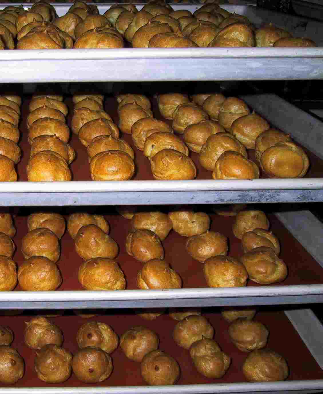 After baking, the cream puffs are injected with dairy cream and custard.